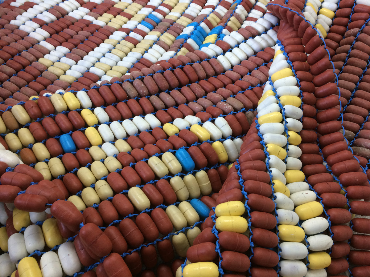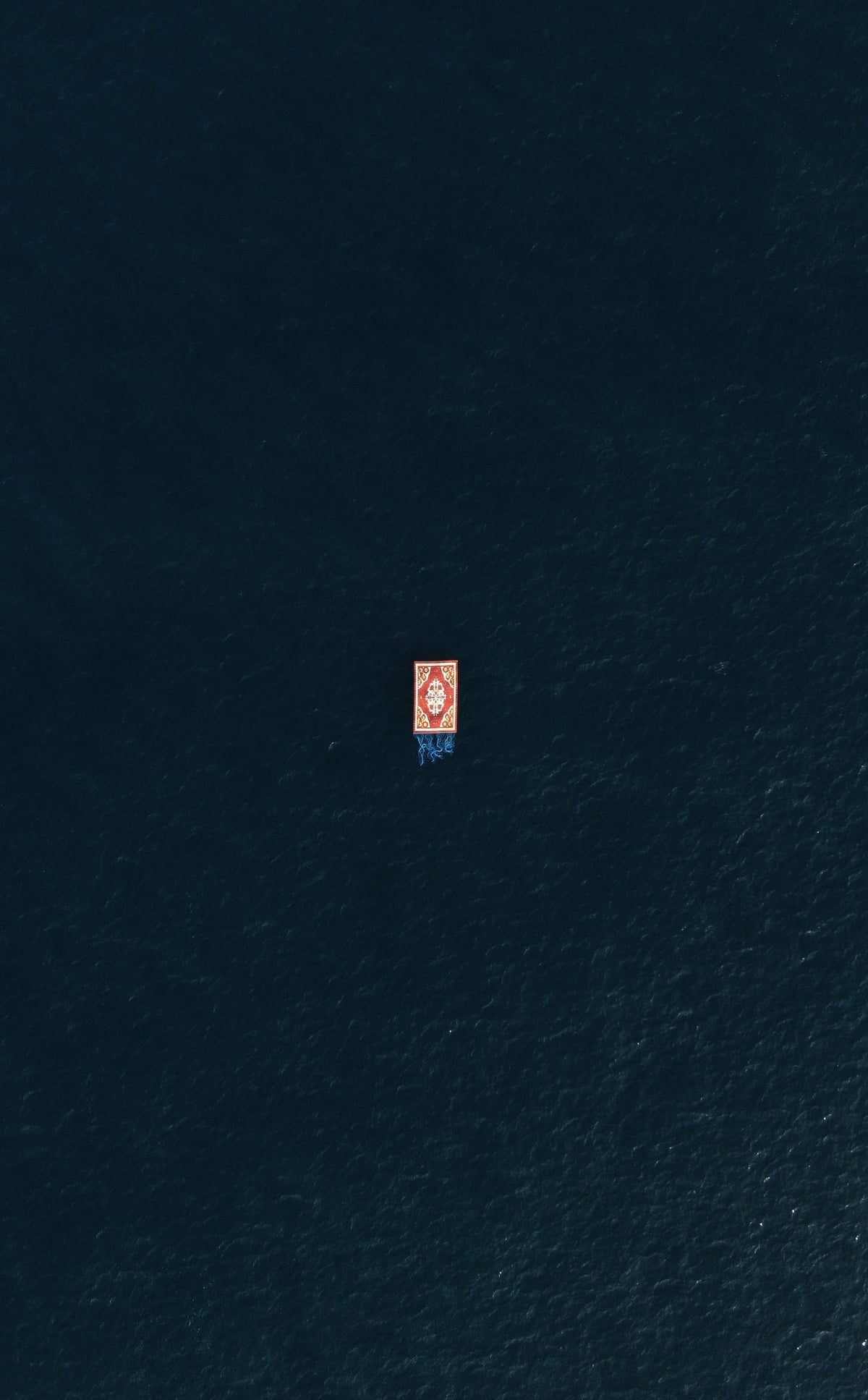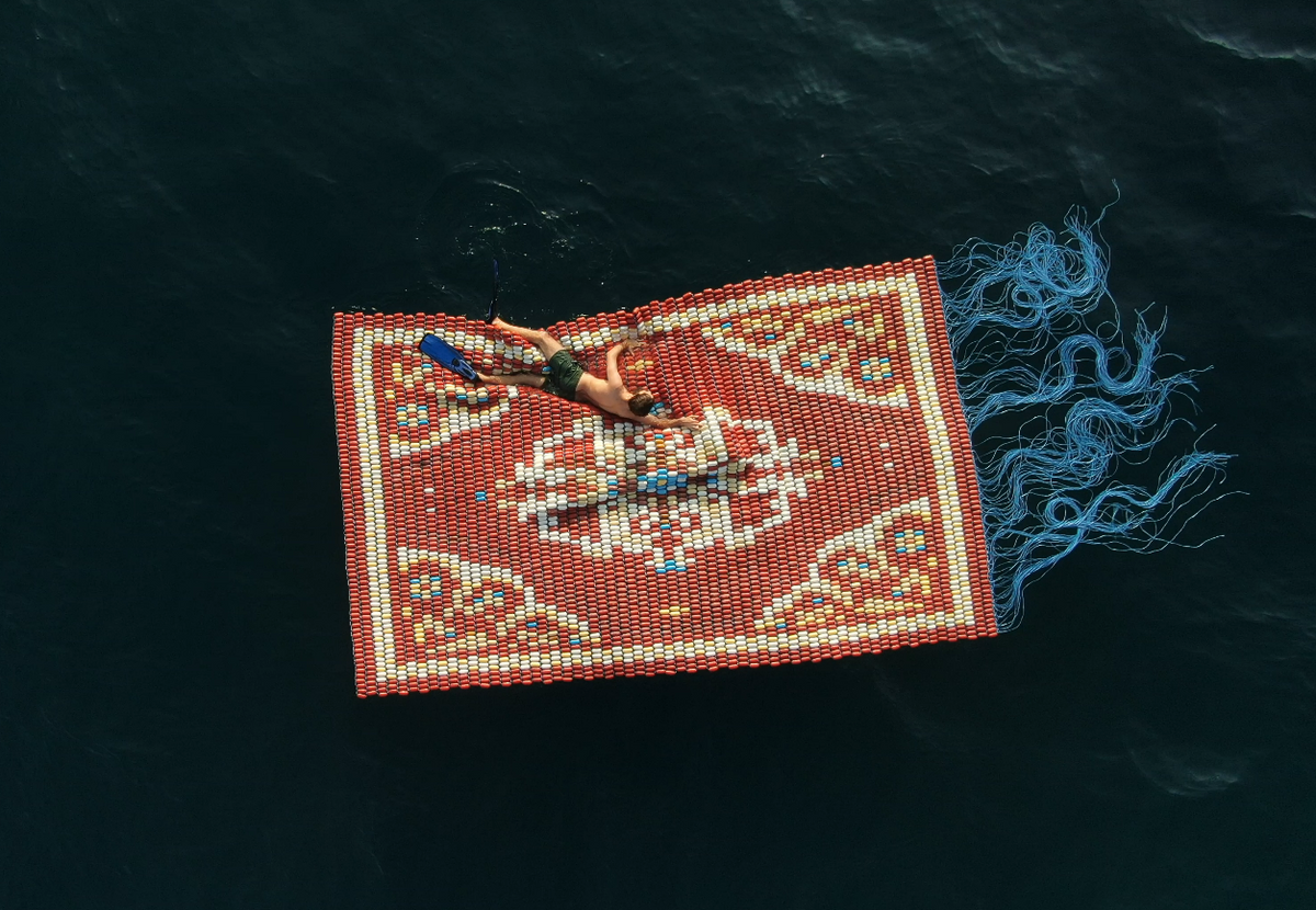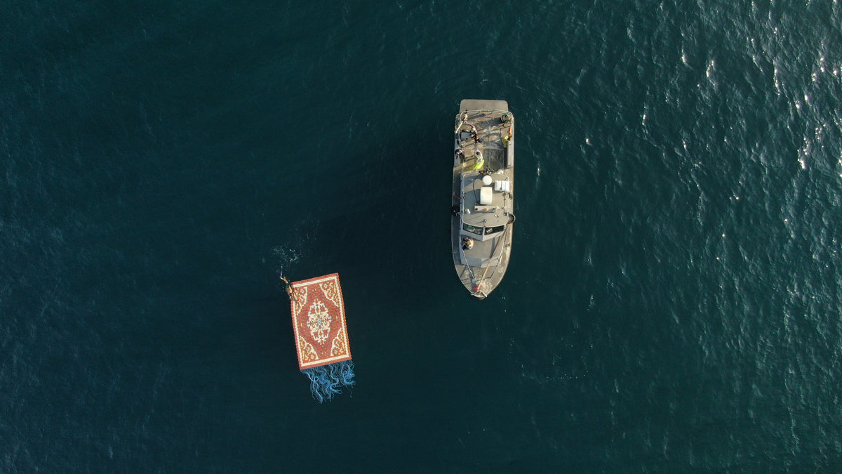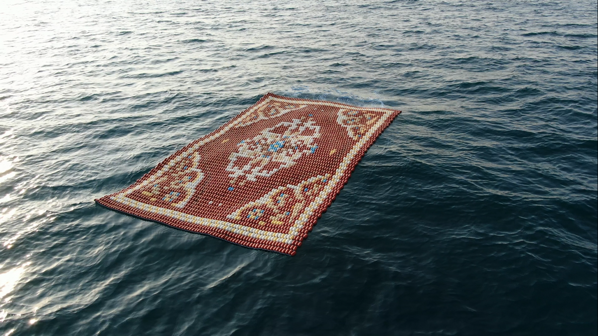 The first part of the work is a sculpture resembling a rug with an Oriental pattern, expanding to a size of 650 x 350 cm. It is woven from ready-made fishing net floats that have been unraveled and rewoven using fishing rope. The second part is a video capturing, from a bird’s-eye view, the rug’s journey across the open sea, far from any safe or sheltered space. Floating on the water’s surface, it marks the transition from the defined to the undefined, challenging the notion of solid, familiar ground and reexamining it within the vast, mysterious, and uncharted depths of the sea.