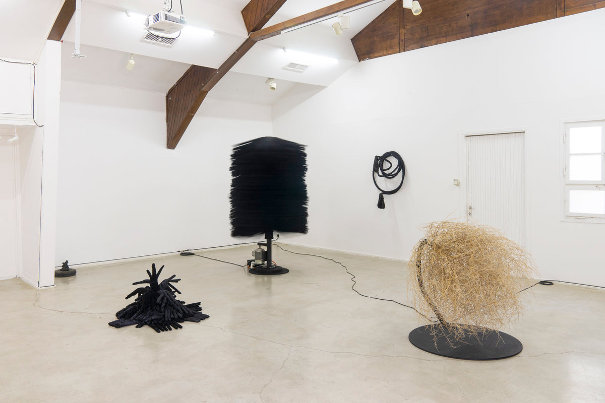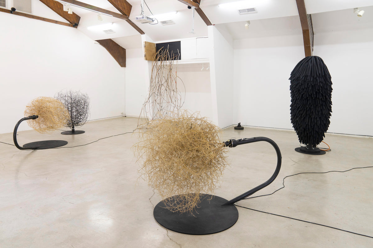 A dry cane with a feathery flower head is tied with a black “collar” made of fine threads that flutter dramatically as the cane spins on its motorized axis, giving the cane the appearance of a dancing scarecrow. Next to the dry branches and shrubs, a tall sculpture stands—an upright column entirely covered in “fingers” of sewn black fabric, filled and stitched together. When it spins using an industrial motor, it looks like a car washing device. Instead of cleaning, it caresses gently or lashes aggressively.