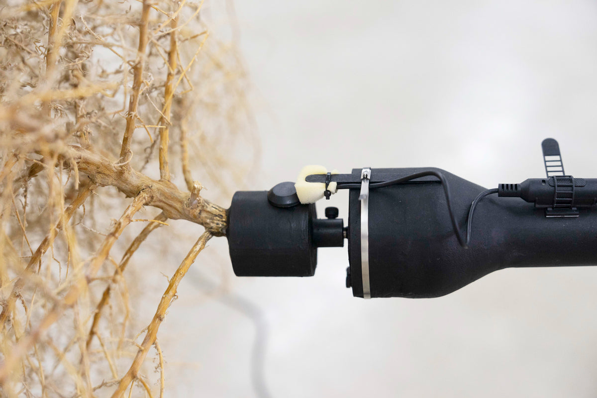 A wash of white neon light gives the gallery space a cold industrial character, accompanied by a repetitive mechanical sound amplified by frequency picking (pickup) scanning the rotation of the shrub and producing sounds of motor squeaks and friction, simulating the rustling of wind, falling water, or the crackling of fire filling the gallery space.