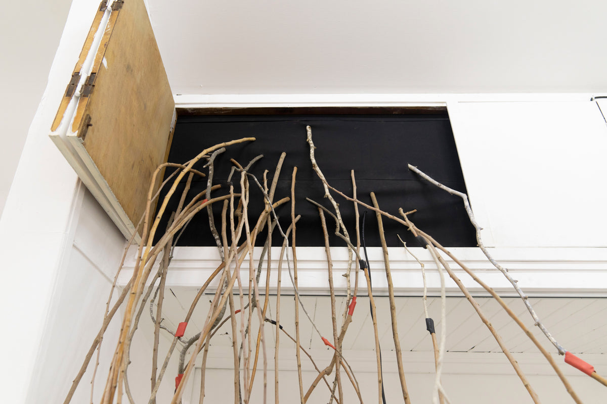 From a tall wardrobe in the gallery space, dry branches and twigs emerge, cascading to the floor like a waterfall. A branch is tied to another by a shrink connector, borrowed from the world of electrical engineering. The “natural” tangle created artificially becomes an organic rhizome with no open ends.