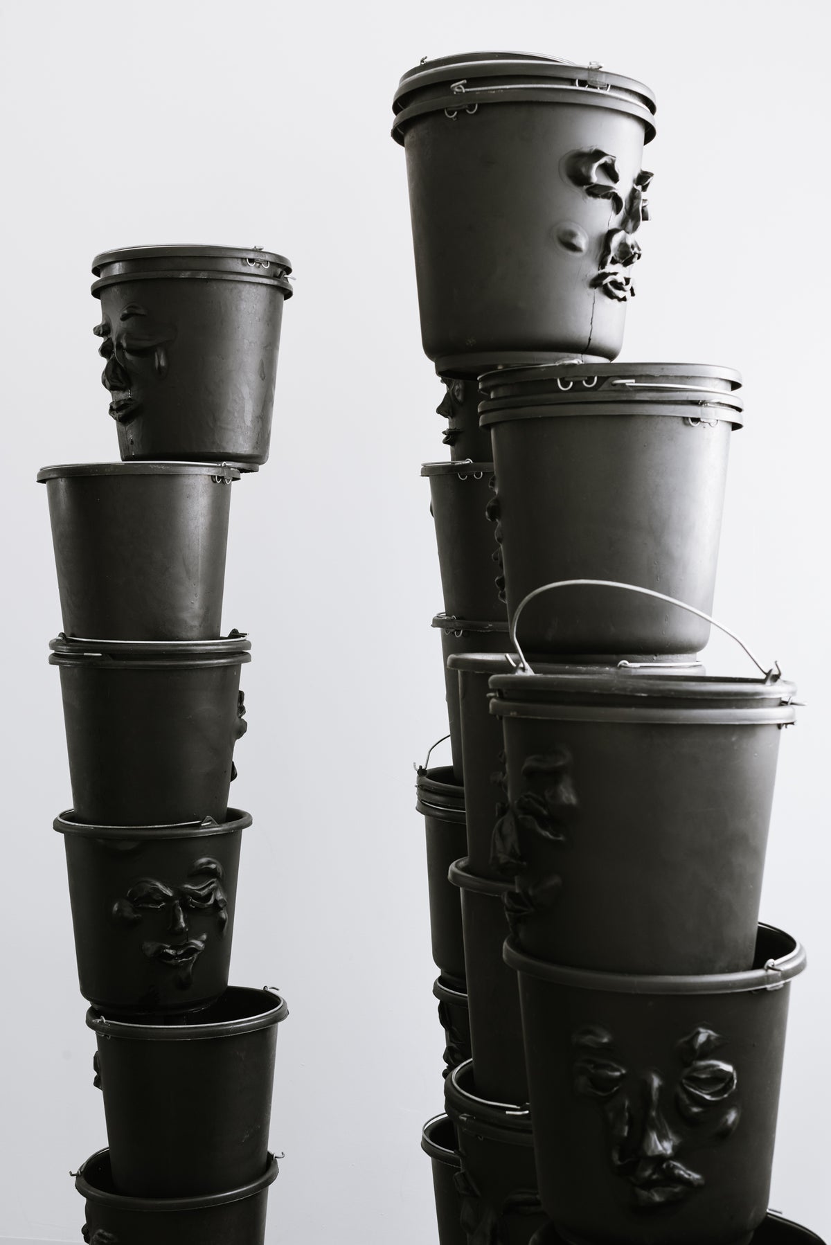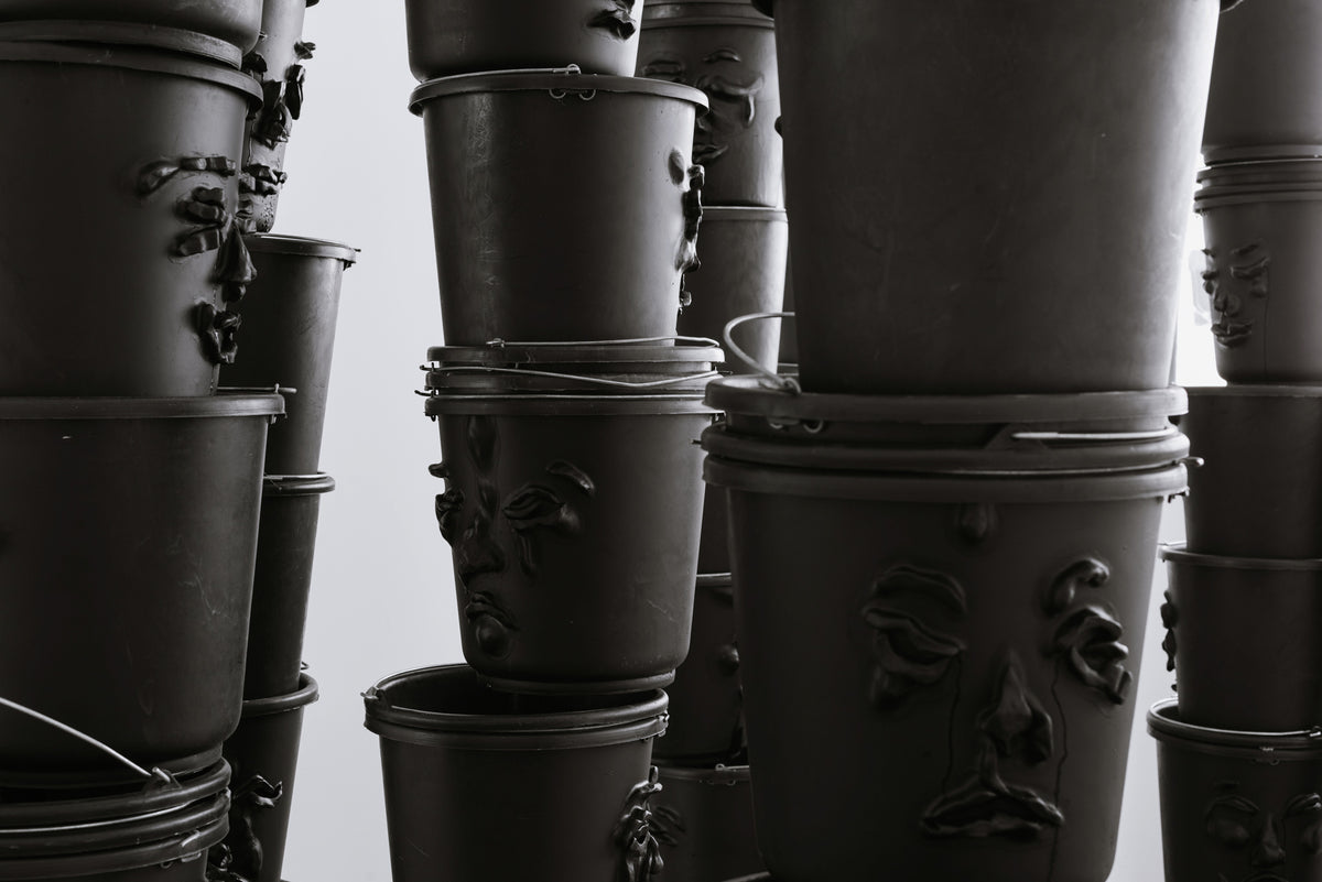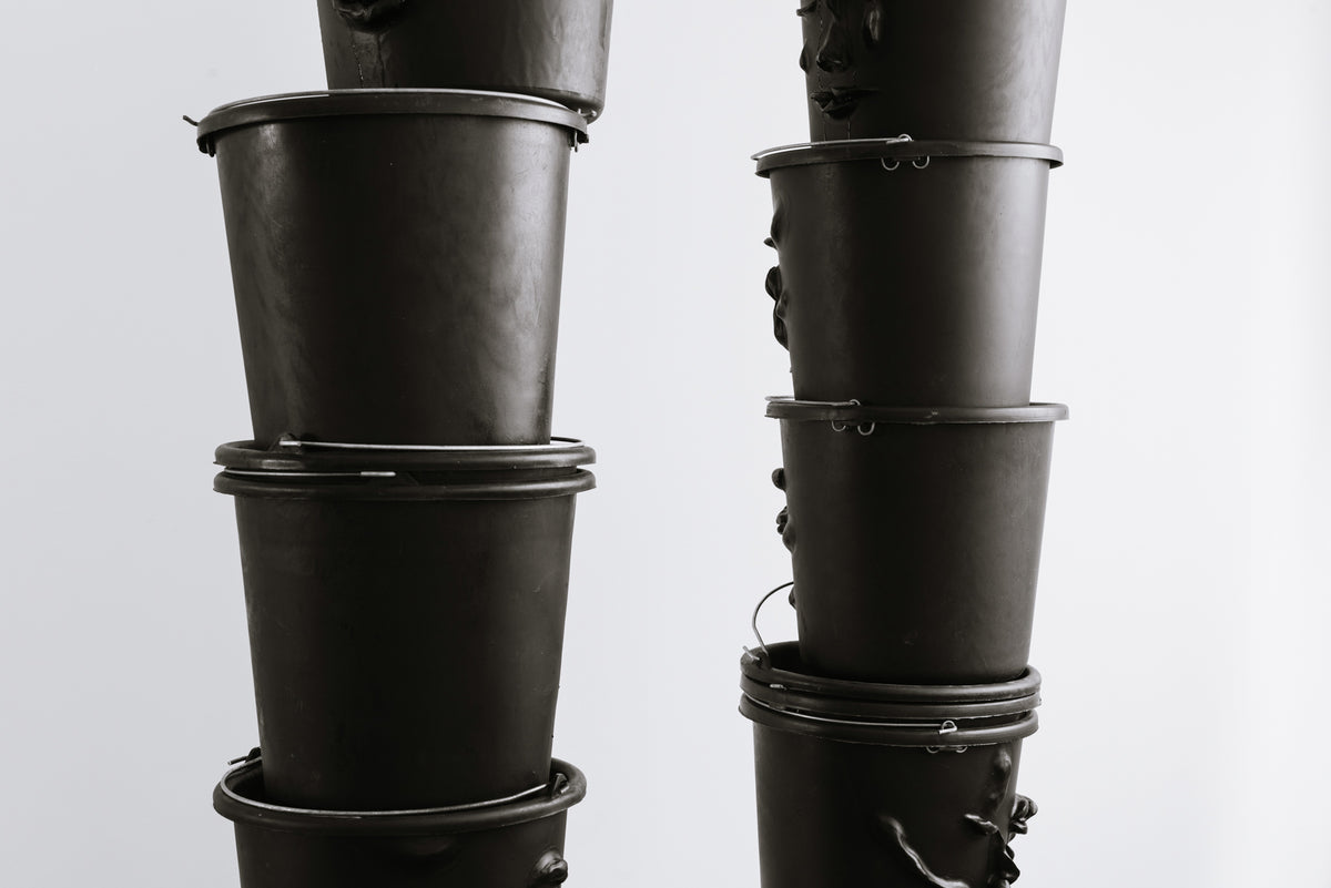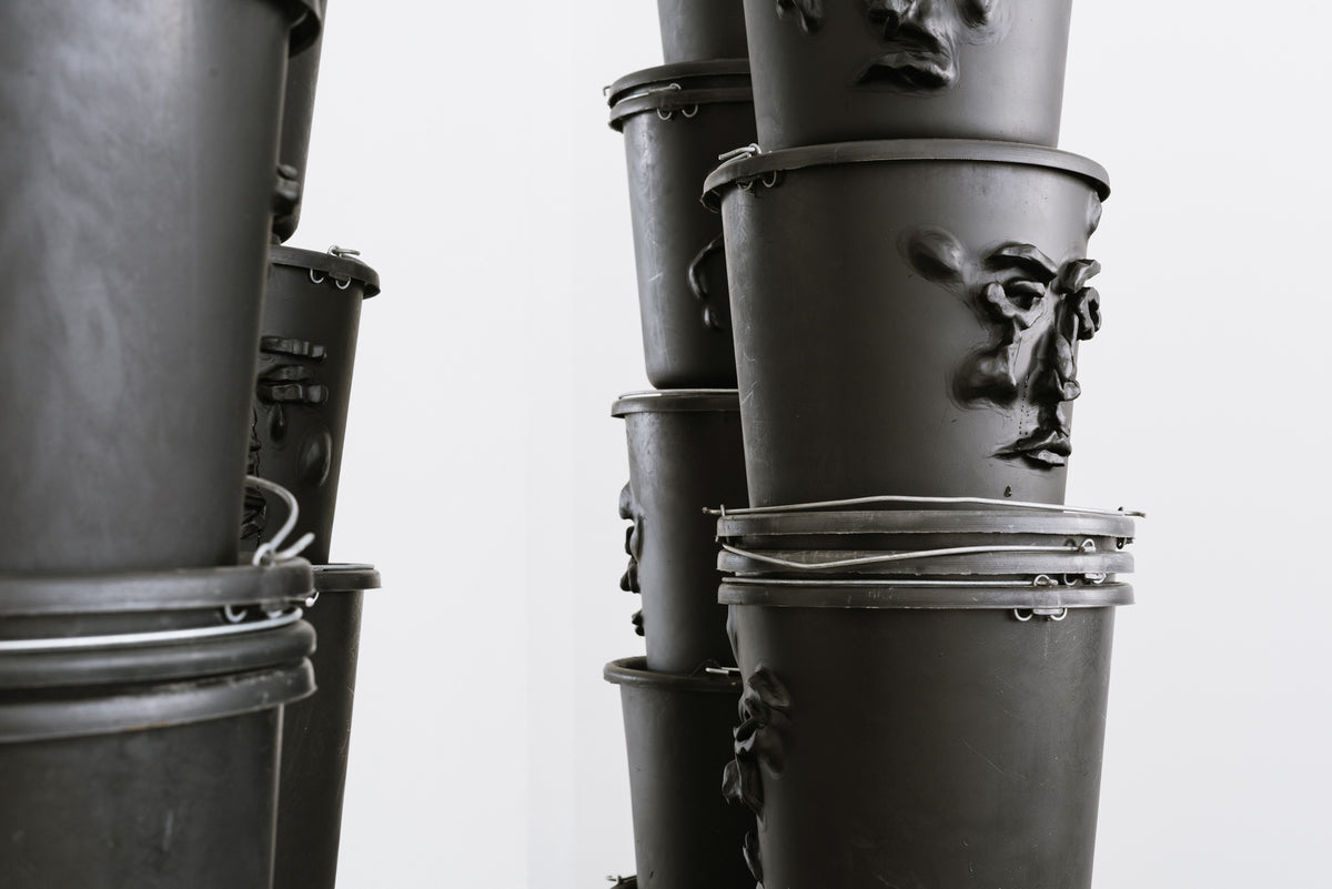 Stacks of black, water-filled, ready-made buckets are piled into towering columns. Through small holes, a thin, continuous stream, resembling tears, leaks from their sculpted eyes. Hidden pumps keep the water in constant circulation, transforming the towers into slow, self-sustaining fountains. In this installation, the first part of News from the Chorus, I adopt the act of cleansing as a system striving for both the release of liquids and the purification of the soul. Inspired by gargoyles and Greek chorus masks, the sculpted faces hover between the comic and the tragic.