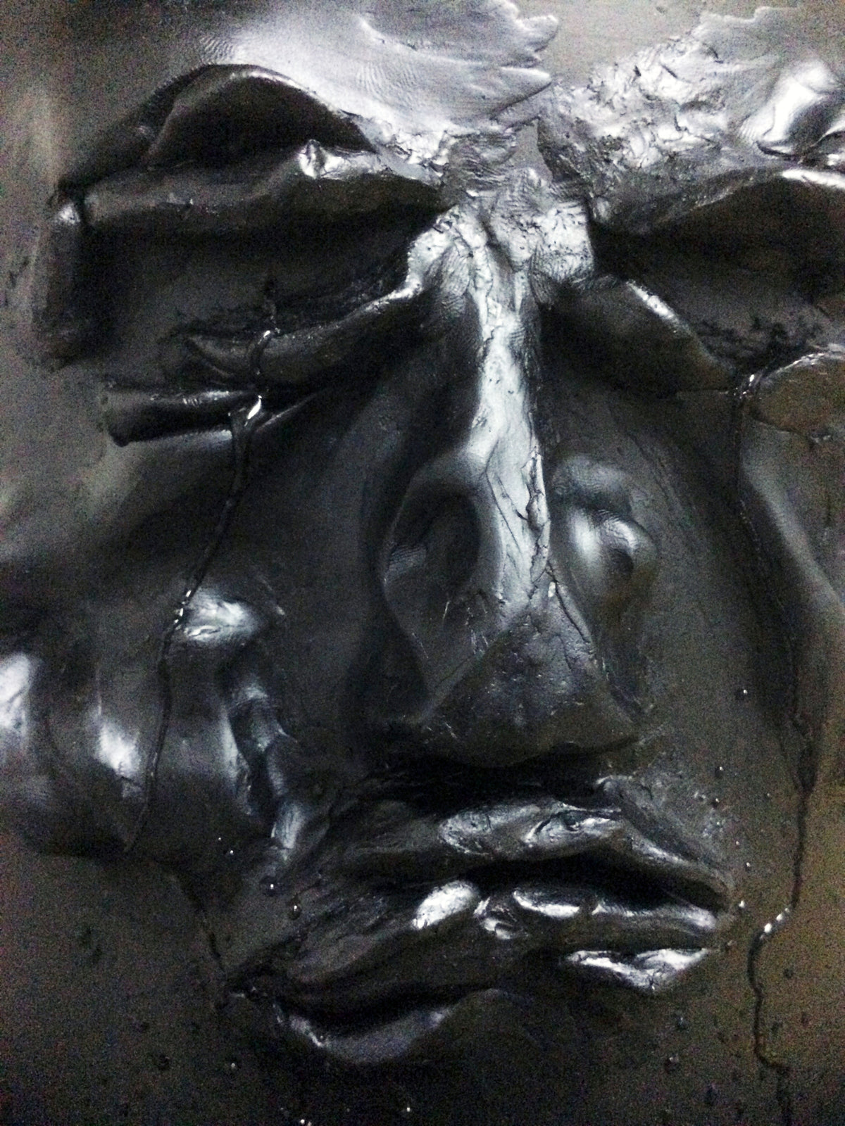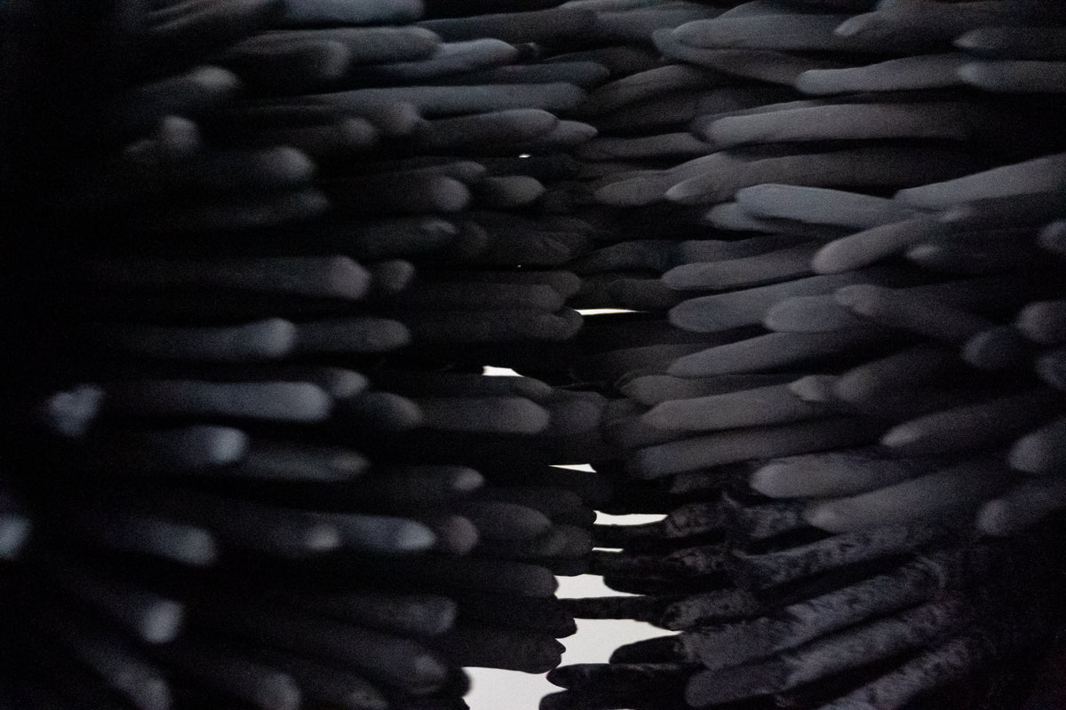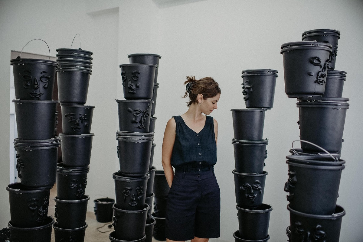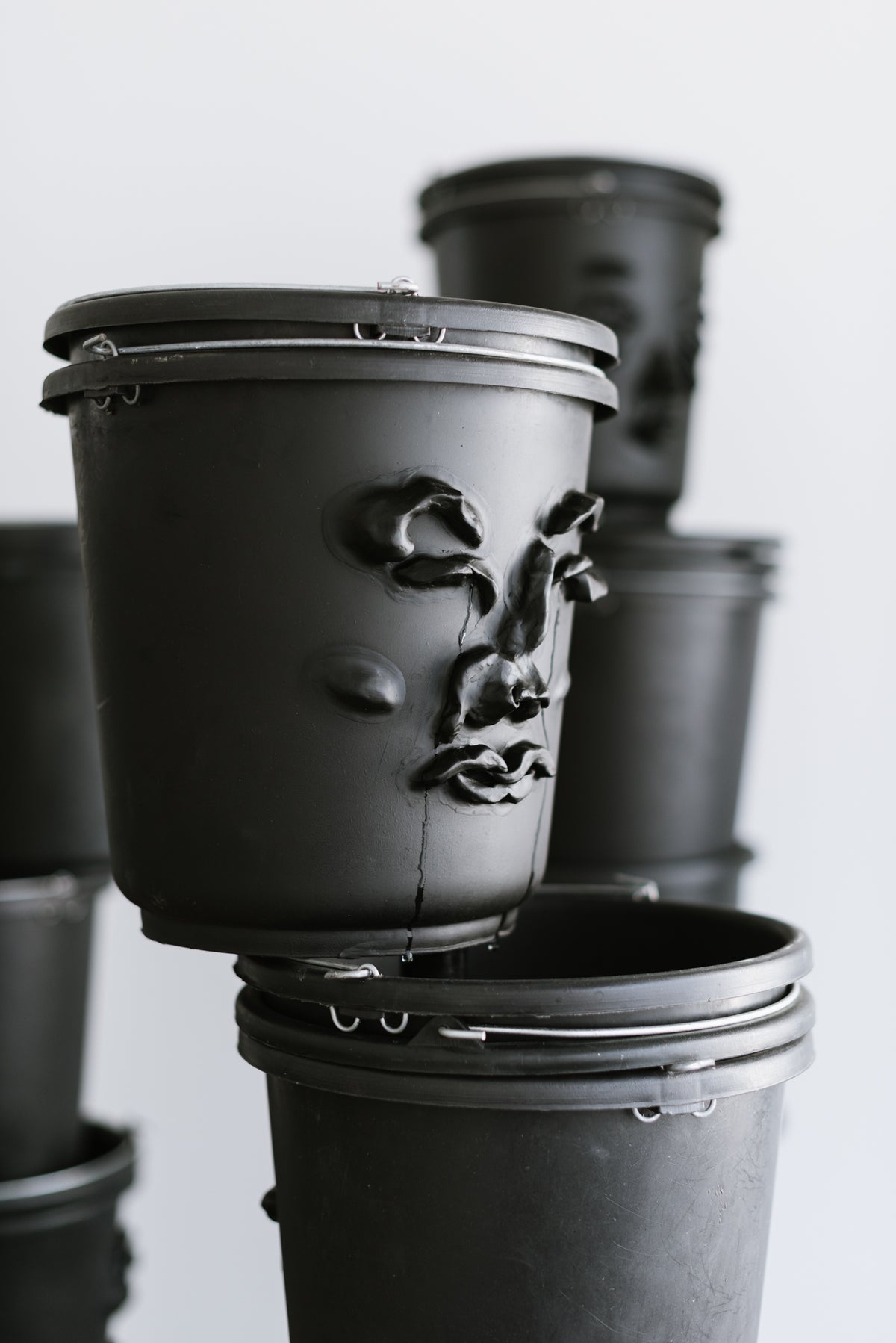 Stacks of black, water-filled, ready-made buckets are piled into towering columns. Through small holes, a thin, continuous stream, resembling tears, leaks from their sculpted eyes. Hidden pumps keep the water in constant circulation, transforming the towers into slow, self-sustaining fountains. In this installation, the first part of News from the Chorus, I adopt the act of cleansing as a system striving for both the release of liquids and the purification of the soul. Inspired by gargoyles and Greek chorus masks, the sculpted faces hover between the comic and the tragic.